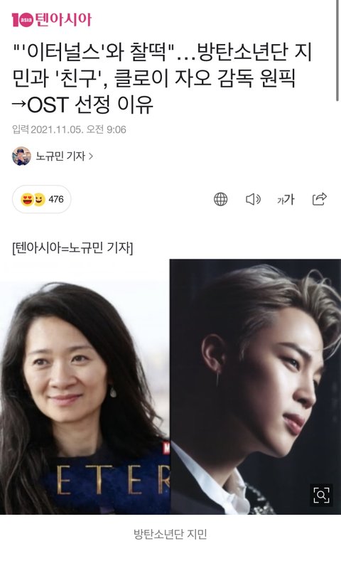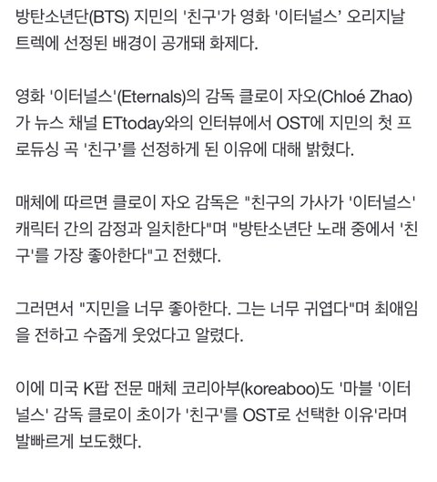 헐 지민이 '친구' 이터널스 OST 선정 이유가 가사가 캐릭터 간의 감정과 일치하고 무엇보다...클로이 자오 감독의 원픽이었대! 월드클라쓰 대박이당...