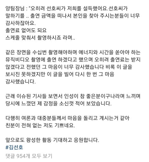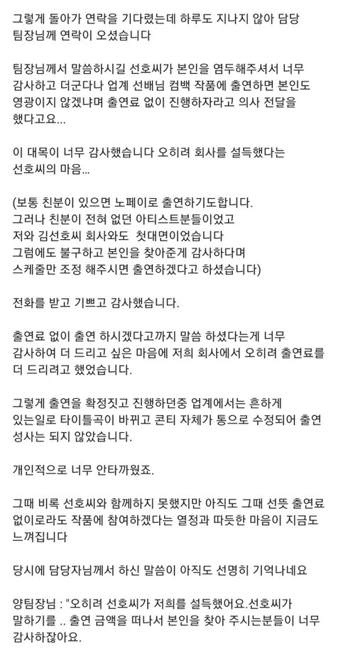나라면 페이는 낮춰도 솔직히 내 노동 내 시간들여가면서 페이 안 받고는 힘들지… 일반인 중에 나 찾아준다는 이유로 하루동안 무급으로 일할게요 라고 말 할 수 있는 사람 있음? 솔직히 없을껄… 저렇게 착하고 바르게 살아왔으니까 김선호가 진짜 힘들때 발 벗고 나서 주는 사람도 많았을거임 미담이 거의 골라보는 미담 맛집 수준인데