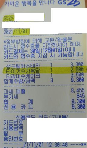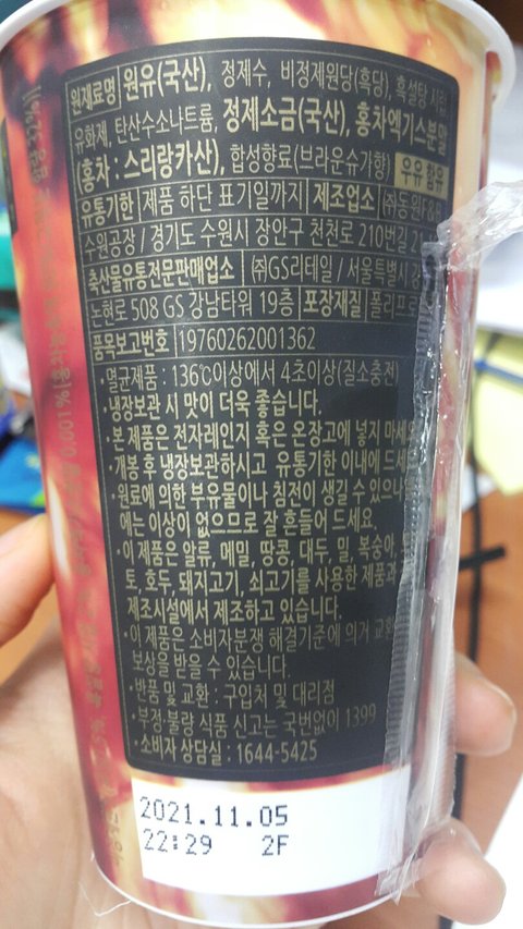 1. 11월 1일 GS 편의점에서 유통기한이 11월 5일인 동* 회사의 멸균제품인 '타이거슈가 흑당 밀크티' 음료수 구입