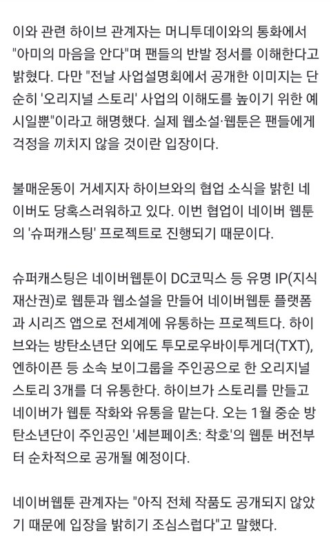 네이버웹툰과 하이브가 만드는 세계관웹툰 알페스 나페스 논란에 대해서 하이브는오리지널시리즈 예시일뿐 팬들이 걱정하는 논란소지 내용들은 포함되어있지않다고 말함.