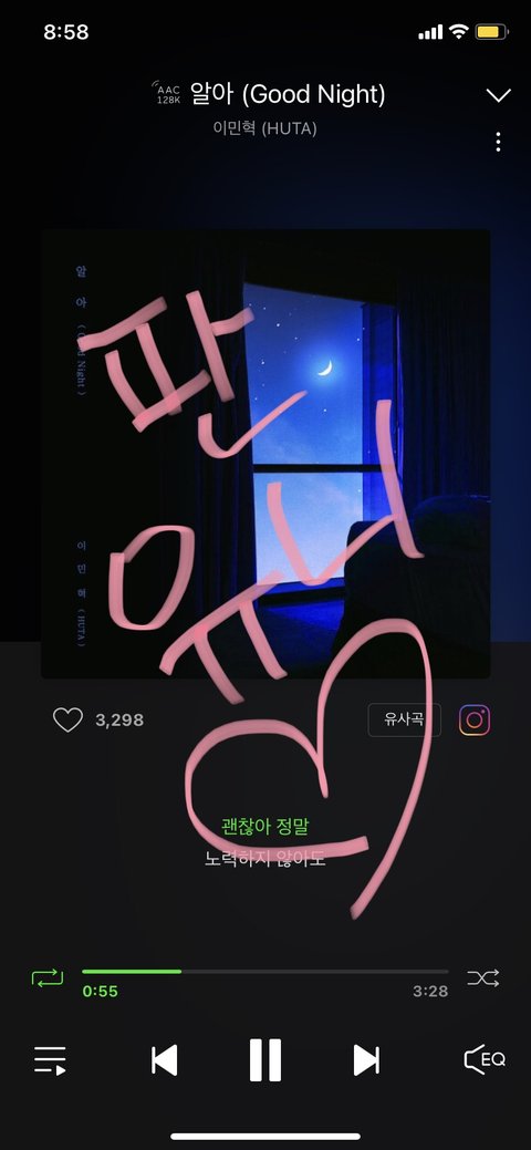 노래 나오자마자 6시에 듣고 너무 좋아서 계속 듣는 중입니다ㅜㅜㅜㅜㅜ노래진짜 너무좋음 잔잔하게 위로가 되네요 !!!