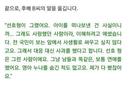 왜겠어? 반박해봤자 시끄럽거든 그리고 글봐서 알자나 김선호도 충격이었을껄 한때 사랑했던여자인데 너무악의적으로썼자나 상대조차 하기싫었을것같아 오히려 사과가낫지 사실 이러쿠저러쿠 말해봐짜 이미지만 더추락하지 그래도 사랑했던 여잔데 자기한테 왜 이러는지 알겠지 모르겠니 최영아같은 여자는 상대를 안하는게 나아 아직도 낙태가 어쩌고 피임이어쩌고 하는 애들 있자나 아무리 설명해도 김선호탓만하는 그런애들 상대해봤자야