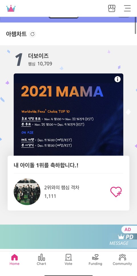 여기다 투표하지마. 쇼챔 투표는 점점 벌어지고 있는데 챔심투표는 1등을 했음 제발