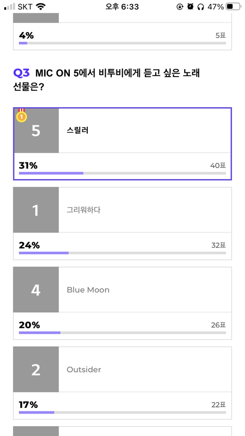 결과보는데 1위가 스릴러여서 약간 의외얔ㅋㅋㅋㅋㅋ 아 근데 8년전에 나온 곡으로 춤추고 노래할 생각 하니까 상상만해도 귀여워 깅이들ㅠㅠㅠ