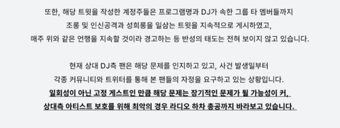 그리고 저쪽이 하차총공하면 우리는 우리 업보다 하고 가만히 있는 건가요? 전 글 끝까지 봐도 오히려 계정 하나때문에 하차총공 위기에 놓인 제 아티스트를 보호하고 싶은데요