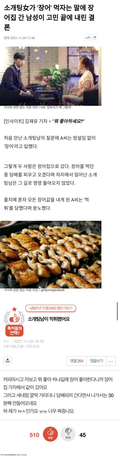 싫으면 의사표현을 하면되지. 말없이 도망가는 남자도 무책임하고 무능한 남자네. 처음만난자리이니, 누가 밥값을 내던말던,, 맘에 안들었으면 담에 가자고 하고 솔직히 의사표현하는게 인간이지. 먼저 밥먹자고해놓고,,ㅋㅋ 그깟 장어 얼마나 한다고, 먹고싶으면 내돈내고 가서 사먹는데, 남자가 찐따같고 추접스러운건 사실임. 잘되어서 계속 만난다해도 저런남자 만날때마다 음식보며 눈알굴리고 대가리굴리면서 계산할텐데 ,먹다 체할듯ㅋㅋ, 계산기 갖고 다니면서 백원짜리도 정확히 해야할것 같은뎈ㅋㅋ 추접해서 저런남자 어떻게 만나냐. 창피해서 못만나지.