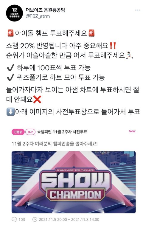 우리 쇼챔 사전투표 지면 사실상 쇼챔 못 먹는다고 봐야해ㅠ 기기당 100표씩 투표 가능하니까 공기계 하나 더 있으면 그걸로도 해줘!