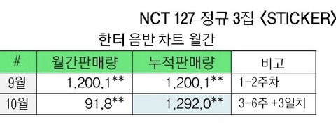 127보다 해외인기 훨 높은 방탄 세븐틴도 다 한터 실판매량에 잡히는데 엔시티 127만 가온 한터 차이가 140만장 찍는중ㄷㄷㄷ