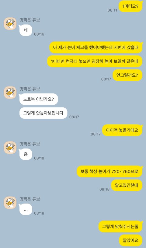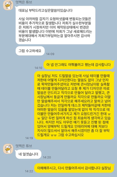 -데스크 임의대로 제작하여 제가 수정 요청드렸어요 그때 제가 하차 싶어서 높이는 확인 못했는데 나중에 높이 몇이냐고 물어보니까 1미터라고 하셔서 1미터에 컴퓨터 놓으면 너무 높을꺼 같다라고 말씀드리니 어떻게 해드릴 방법 없다고 밑에 잘라주겠다 하셔서 또 몇시간 동안 입씨름 하기 싫어서 밑에 잘라달라고 말씀 드렸어요. 데스크 만들기 전 저한테 일체 물어보지 않고 자기 마음대로 만들었는데도 일단 참았습니다.
