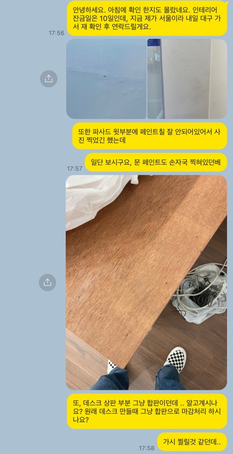 -이때부터 사장이랑은 말이 안통할거 같아서 실장한테 제 가게좀 신경 써달라 말한 뒤 실장이 카톡으로 마루바닥 샘플 몇개 사진(빛때문에 제대로 된 색감이 안보입니다.)으로 보내 주셨어요, 이때 당시 제가 퇴사 전이라 다른지역에 있어서 사진으로 보내준거 감사하지만 보통이면 업체와 업주간 시간 맞춰서 미팅을 잡아서 진행하지 않나요? 제가 그때는 빨리 선택해 달라고 말씀하셔서 카톡으로 선택해서 말씀 드렸지만 추후 이건 아닌거 같아서 제가서 직접 샘플보고 확인하겠다고 요청 드려서 인테리어 업체 시공하는 공사 현장가서 직.접 보고왔습니다.