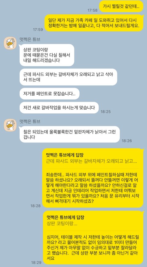 -파사드 부분 페인트 깔끔하지 못해 사진 찍어서 전달드리니 파사드 외부는 갈바자체가 오래되고 낡아서 페인트로 못 잡는다 갈바작업을 해야한다 라고 말씀을 해주셨습니다. 그럼 애초에 페인트 칠 시작할때 제게 이렇다 저렇다 얘기를 해주셔야 되는게 맞는거 아닐까요?