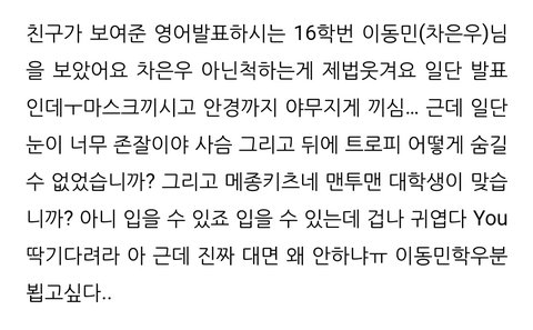저 사진 차은우야? 아무리 그래도 허락없이 찍는건 아니지 않나? 나라면 완전 불쾌할듯.. 연예인이라고 꼭 모든것을 보여줘야하나 얼마나 본인을 드러내기 싫었음 아닌척을 할까