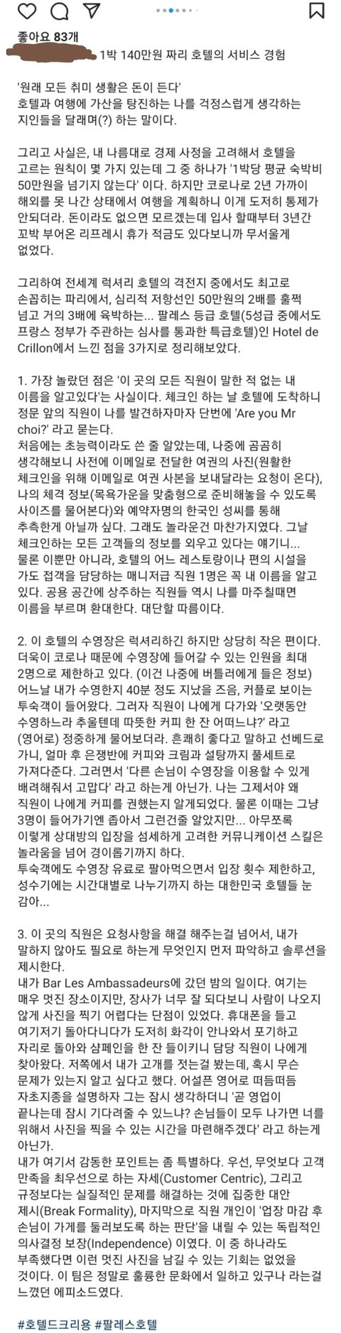 1.이메일로 전달한 사진만으로 전 직원이 알아봄 2. 혼자 40분 수영하다 커플 투숙객이 수영하러 오니 따뜻한 커피를 권유하며 커플 투숙객이 즐길 수 있게 도와줌 (자길 챙겨주면서도 타인 까지 챙겨주는 센스) 3. 직원 개인의 판단만으로도 영업 후 사진촬영 가능하게 해줌