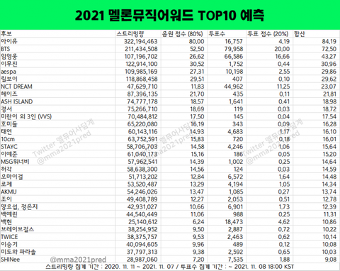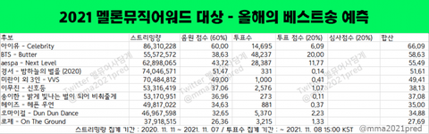 2. 아래 표 보면 투표 점수 20점(투표 1위할 시 받아갈 점수)이 꼭 있어야 대상 근접권 돼서 심점으로 뒤집을 여지가 생김