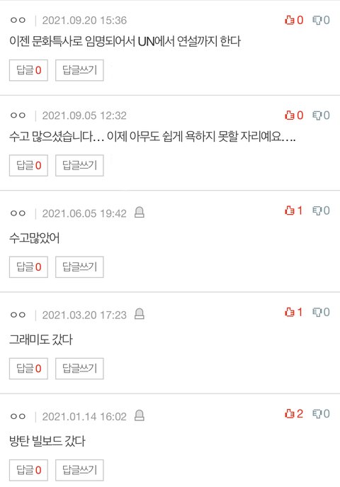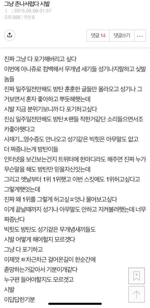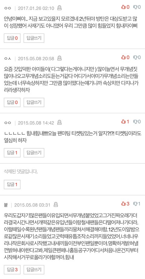 옛날에 본 적 있는데 걍 판 구경하다가 또 보여서 올려봄… 이거 처음 읽고 감정 복잡했는데 댓글 달라지는거 보니까 쫌 눈물남 내가 방탄 인생을 처음부터 함께하지는 않았지만 그 당시 인터넷 분위기 알아서 내 영혼까지 가만있지를 못하는 느낌..