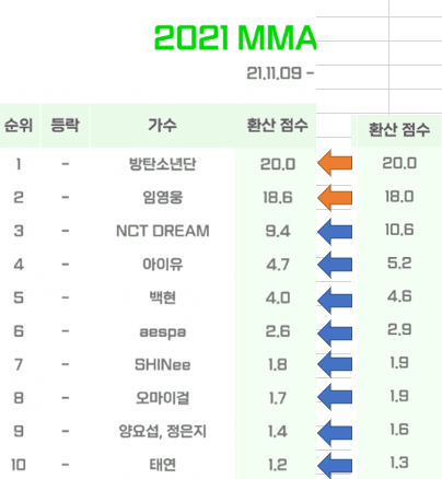 방탄, 임영웅 1,2위 구도로 아래 엔시티드림, 아이유, 백현, 에스파, 샤이니 표 눌림 벌써부터 엄청 생기기 시작함