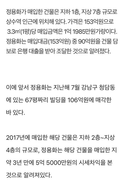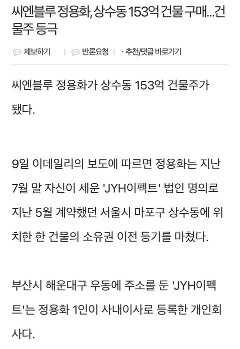 씨엔블루 정용화, 상수동 153억 건물 구매…건물주 등극