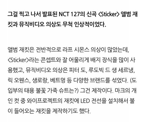 그걸 찍고 나서 발표된 NCT 127의 신곡 <Sticker> 앨범 재킷과 뮤직비디오 의상도 무척 인상적이었다.