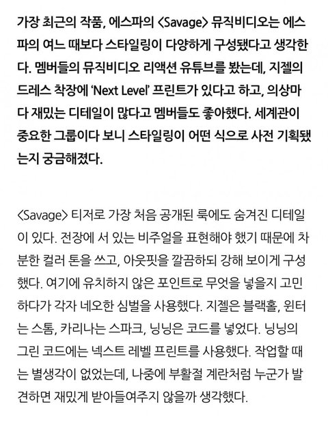 <Savage> 티저로 가장 처음 공개된 룩에도 숨겨진 디테일이 있다. 전장에 서 있는 비주얼을 표현해야 했기 때문에 차분한 컬러 톤을 쓰고, 아웃핏을 깔끔하되 강해 보이게 구성했다. 여기에 유치하지 않은 포인트로 무엇을 넣을지 고민하다가 각자 네오한 심벌을 사용했다. 지젤은 블랙홀, 윈터는 스톰, 카리나는 스파크, 닝닝은 코드를 넣었다. 닝닝의 그린 코드에는 넥스트 레벨 프린트를 사용했다. 작업할 때는 별생각이 없었는데, 나중에 부활절 계란처럼 누군가 발견하면 재밌게 받아들여주지 않을까 생각했다.
