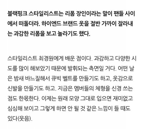 블랙핑크 스타일리스트는 리폼 장인이라는 말이 팬들 사이에서 떠돌더라. 하이엔드 브랜드 옷을 절반 가까이 잘라내는 과감한 리폼을 보고 놀라기도 했다.