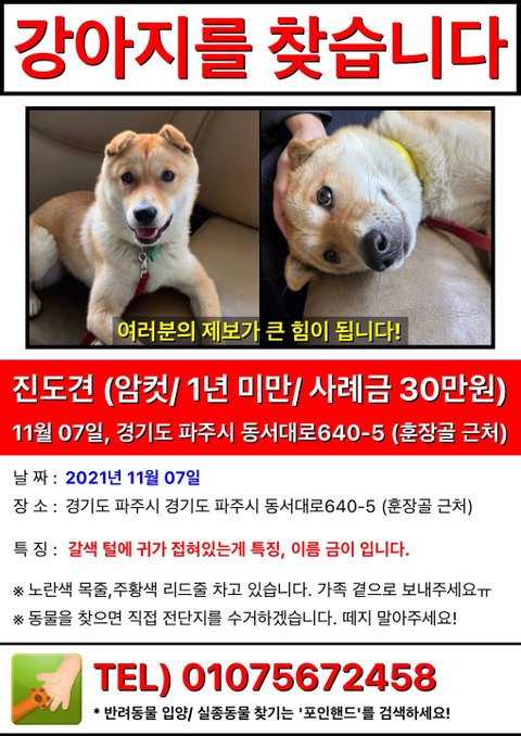 안녕하세요. 파주 운정 훈장골 근처에서 금이를 잃어버렸습니다. 노란색 목줄에 주황색 리드줄 차고 있었고 귀가 접혀있는게 특징입니다. 지나가다 목격하시면 꼭 연락 부탁 드릴게요…