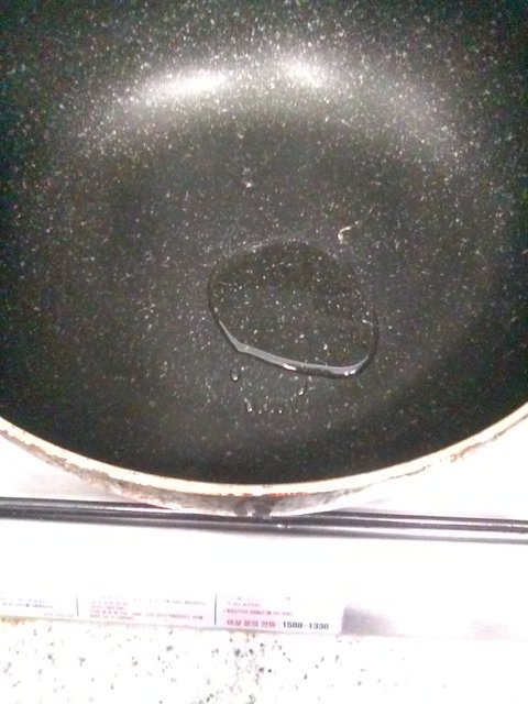 물이 끓는 동안 계란후라이를 만들기 위해서 팬을 달군 뒤 기름을 둘러줘요