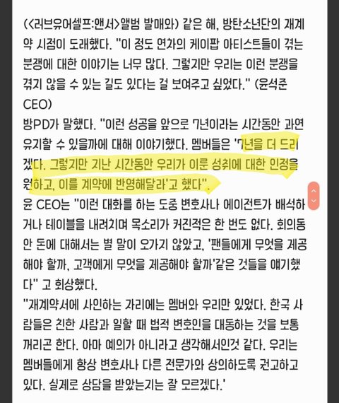그러니까 본인들의 성과를 회사가 인정하지 않는다는 걸 느끼고 있었다는 거임. 얼마나 싸가지없게 대했으면 멤버들이 계약조건으로 '성과 인정'을 요구함?