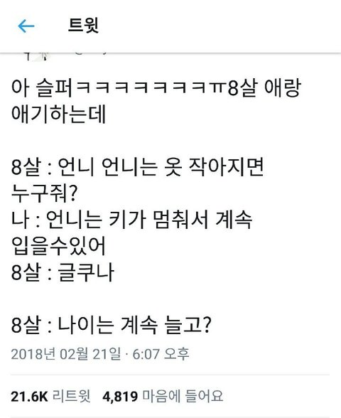 ㅋㅋ 애한테는 키큼=나이 먹음 같은건데 키가 멈췄다니깐 나이는 먹는거냐고 물어본 듯