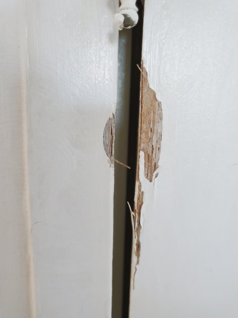 그런데 조금 이따가 좀 이상한게있다고 해서 가보니 작은방 붙박이장 문이 손상되었더군요