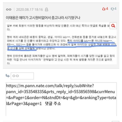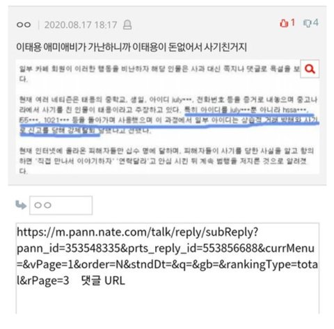 슴 전연생인척 하고 글쓴것도 "태용 인성 걸X 맞다 " 요거 딸랑 한줄 쓴게 다이며 본인이 언제 연습생을 했다는 건지 태용에 대해 왜 그렇게 생각하는지 아무거도 없어서 이슈가 안된 일을 이 악플러 혼자 주구장창 슴 전연생 폭로라면서 각종 커뮤니티에 도배질을 하는데 자기가 써놓고도 하루나 이틀뒤 반드시 글 지우는걸 보면 악플러 본인도 책임못질 허위사실이란거 알고 있다는 증거이니 검거해서 조사해 주시기 바랍니다