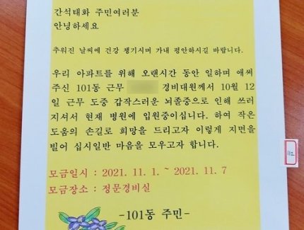 “오랜 시간 동안 애써 주신 경비대원께서 근무 도중 갑작스러운 뇌졸중으로 쓰러지셨습니다. 작은 도움의 손길로 희망을 드리고자 십시일반 마음을 모으고자 합니다.”