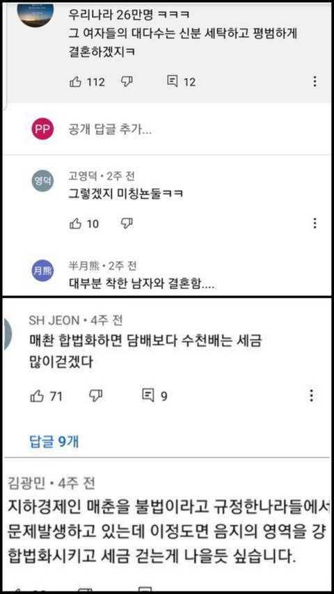 우리나라가 세계 매춘시장 6위이고 성매매 여성이 26만명인데 거기에 달린 댓글에 매춘여성에 대한 혐오가 대단함 근데 또 다른 댓글에서는 합법화 해야된대 혐오하면 근절을 해야지 빡대가리들ㅋ 매춘여성이 26만명이면 성매수남은 수백만명 될듯