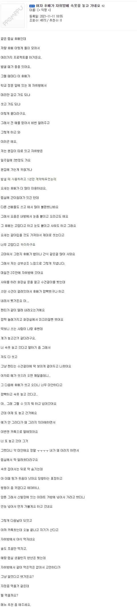 결론이 후배가 저한테 관심있는 걸까요 / 왜 자꾸 속옷을 두고가는 걸까요도 아니고 오늘 뭐 먹을까요 ㅋㅋㅋㅋㅋ