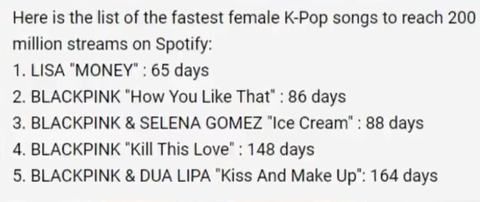 여자 Kpop 노래 스포티파이 2억 스트리밍 최단 도달 순위 5위