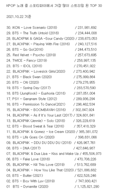 * BTS & Coldplay - My Universe(2021) , LISA - Money(2021) 가 이번 달에 새롭게 30위 진입 할 듯