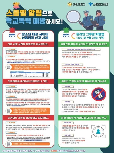 서울경찰청 관계자는 "경찰과 서울시교육청, 현직 교사 등으로 구성된 태스크포스(TF)에서 스쿨벨 시스템을 만들었다"며 "카카오톡 채널이나 e알리미, 학교 등에서 신종 학교폭력에 대한 정보를 주기적으로 공유할 예정"이라고 밝혔다.