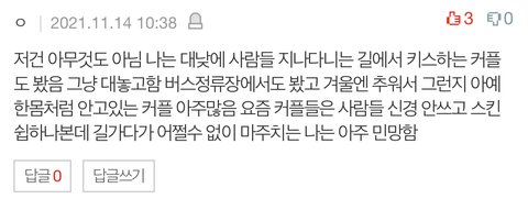 +) 댓글 반응 뭐냐 내가 그딴 애들을 왜 부러워해 ㅋㅋ 나는 뭐 안사겨봤나 애초에 길거리에서 지들 애정행각하는게 지능 떨어지는거지 ㅋㅋㅋㅋ 이걸 부럽다 이러고 있네 ㅋㅋ