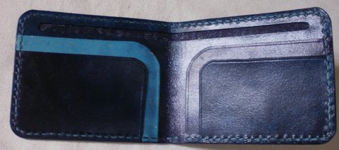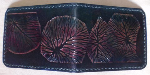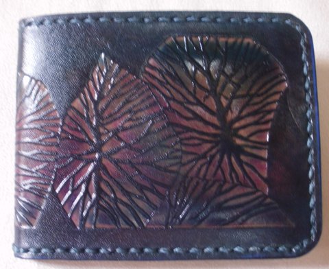 가죽에 나뭇잎 디자인을 스탬핑하고 천연 염색하여 제작한 가죽 지갑입니다.(마디샤)