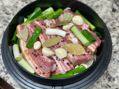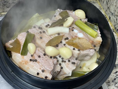 그 위에 대파 1-2대를 썰어 넣어주고, 알마늘 10-15톨, 통후추 여러알, 소주 종이컵 반컵정도 넣어주고 1시간정도 중약불로 뚜껑닫고 끓여주면됩니다.(중간에 한번 열어서 고기를 뒤집어주세요)