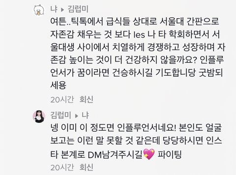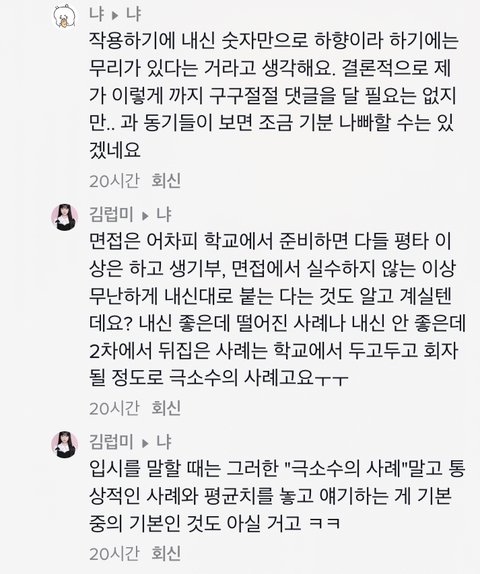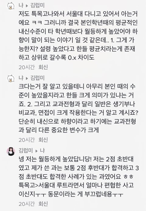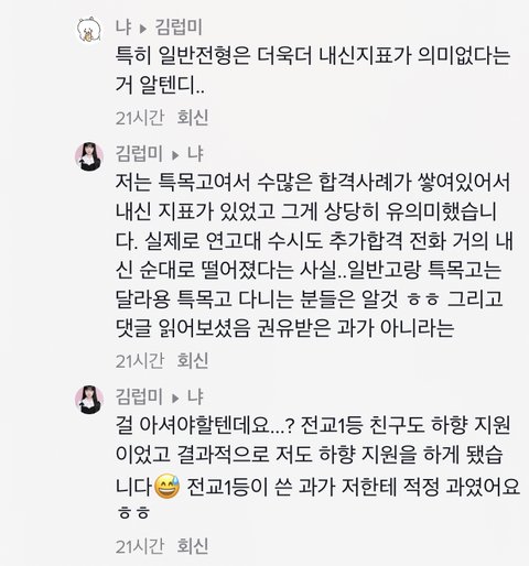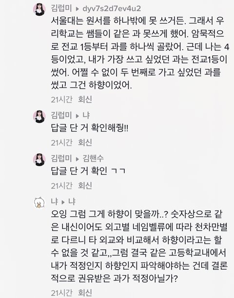결론적으로 말하면 전교1등이랑 같이 넣기는 자기가 떨어질것 같아서 쪼달리고 서울대 가고는싶고 해서 과를 낮춰서 넣은거잖아ㅋ 서울대 가고싶어서 원하는과 포기하고 딴과 간건데 그게 어떻게 ‘서울대도 나한테는 하향이어서’가 되는거임ㅋㅋㅋ 말을 너무 허세 팍팍 넣어서 하니까 욕먹는거지ㅋㅋ