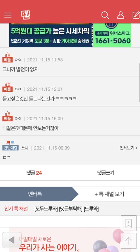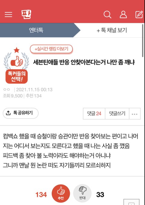 젭알… 먹금은 해도 베댓은 갈고 먹금하면 안되겠냐 아무리 셉 싫어하는거 판에서만이라 해도 베댓 저따구로 올라가있으면 주입식으로 세뇌당하는거 한순간이야.. 본문 반대도 좀 눌러줘..