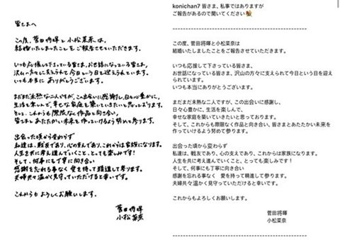 "스다 마사키와 고마츠 나나가 결혼했다는 것을 보고하겠습니다.