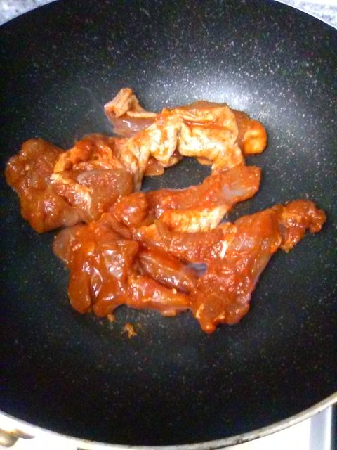적당히 달궈진 팬 위에 닭갈비를 먹고 싶은 양만큼 올려주시고(저 닭갈비는 저희 엄마가 인터넷에서 주문하신거에요 ^3^)