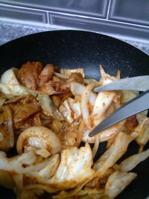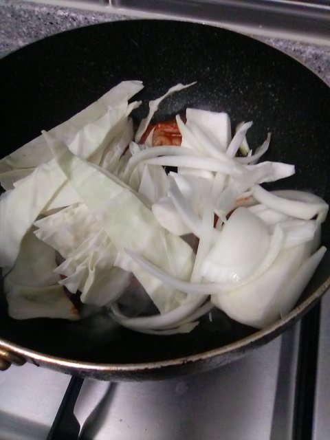 그 위에 양배추와 양파를 되도록 많이 넣어줄게요(저 양파랑 양배추도 엄마가 썰어서 준비해주셨어요 ^_^ 아 그리고 닭갈비를 볶다보면 양파랑 양배추에서 물이 나오기 때문에 따로 물을 넣거나 그럴 필요는 없고 너무 탈 것 같다 싶으면 조금씩 물을 넣어주시면서 중불에서 타지 않기 볶아주시는 게 중요해요 ^_^b)