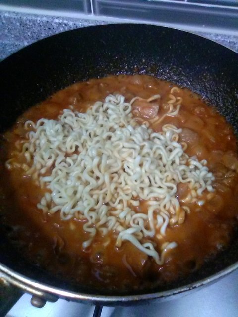 면이 풀어지기 시작하니까 불을 끄고 크림불닭갈비에 넣어줄게요(근데.. 이게 잘못된 선택이었던 것 같아요.. 불닭볶음면 레시피 자체도 면을 더 끓이고 난 뒤에 소스를 넣고 볶아야 면에 잘 스며드는데 제가 그 점을 생각 못 하고 덜 끓여버렸어요 이렇게 하면 면에 소스가 더 잘 스며들겠지 하면서..ㅠㅠㅠㅠㅜㅜㅠ.. 여러분은 좀 더 끓이고 넣으세요..^_^)