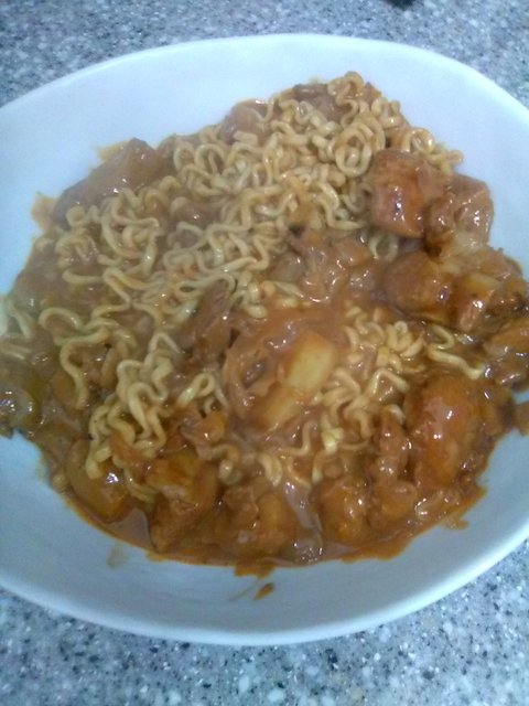 그리고 이제 면을 소스에 좀 더 끓여주시고 그릇에 담아주시면 크림불닭갈비볶음면 완성 ^_^