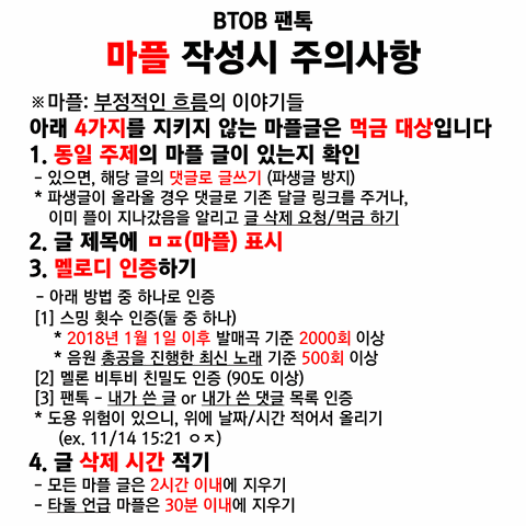 완전체 되고 신난 마음도 알겠고 다 알겠지만 행복한 팬톡생활을 위해서 조금이라도 마플로 흘러갈것 같으면 규칙 좀 잘 지켜줬으면 좋겠음이요..