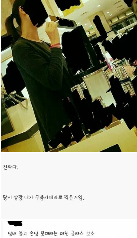 물론 진상손놈 참교육한건 잘한거지만 그와별개로 백화점에서 담배물고 껄렁거리는걸 욕하는 여자들은 거의없었어, 정말로, 단 한명도. 안믿기면 페북에 인천예수쳐봐...
