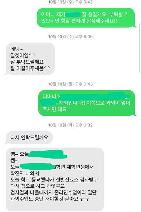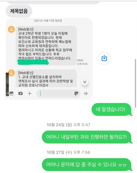 그리고 그 다음날인 19일에 학교에서 코로나 확진자가 나와서 과외를 잠시 중단해야 할 것 같다고 연락이 왔습니다.