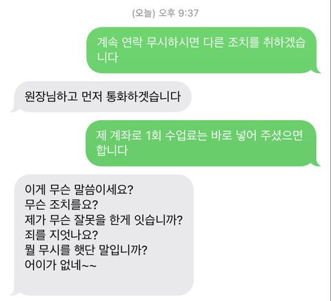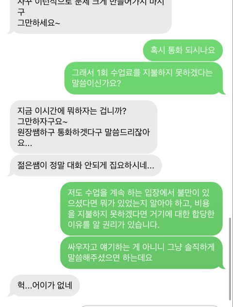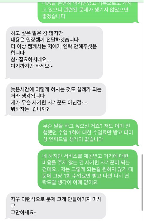 저도 계속 신경이 쓰였고 계속해서 잠적하는 태도에 기분이 썩 좋지 않아서 오늘 조치를 취하겠다고 문자를 보냈습니다. 희한하게 그 문자를 보고는 기분이 나쁘셨는지 바로 답장을 하시더라구요. 그렇게 해서 하게 된 문자가 저렇습니다. 업체랑 이제 통화하겠다는 걸 보면 수업에 문제가 있어서 즉각적으로 얘기가 됐던 것도 아닌듯 하고, 그냥 공짜수업받고 잠수타려다가 걸려서 뜨끔한 걸로밖에 보이지 않습니다.. 1회 수업료 얼마 된다고 그거 안받으면 그만이지만, 열받아서 최대한 골치아프게 하고 싶어요 제가 어떻게 하면 될까요?